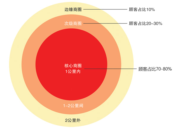 边缘商圈 商铺辐射力的最外围区域,品牌影响力减弱,但仍有10%以上的顾客开发空间,重点开发外卖业务。