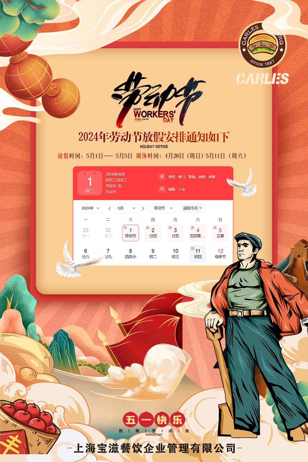 宝滋餐饮企业祝广大劳动者、全体员工、加盟伙伴们“五一”快乐!让奋斗在一线的我们在这明媚春日里,所愿皆所得!