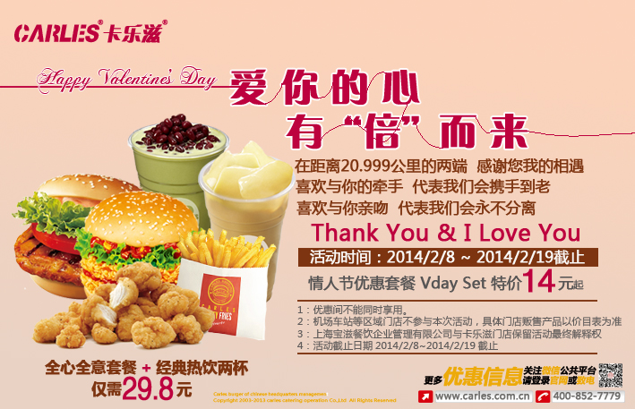 活动三:购买任意组合套餐加2元即可获得玫瑰花一只(仅限2月14日当天,数量有限,送完即止)