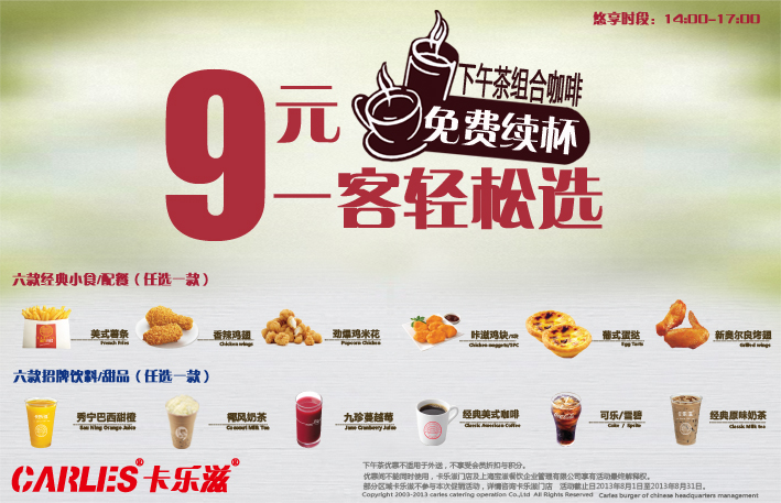 暑假期间,是每年西式快餐相对的经营旺季,炎热的夏天让更多的消费者,年轻人流连于美食与环境俱佳的西式快餐厅,卡乐滋抓住商机,给广大消费者提供一个相对轻松,舒适的聚会休闲场所。并选择经典小食与清凉饮料搭配,让大家边吃边聊,或学习,发呆。